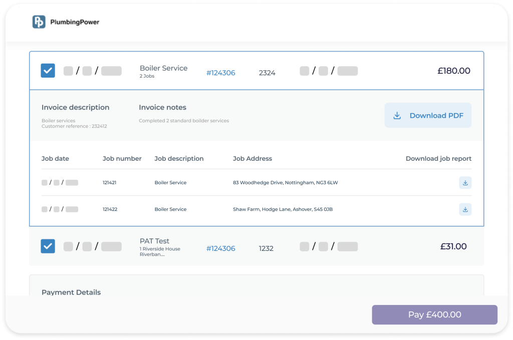 Create bespoke invoice templates, complete with full pricing breakdowns, site photos, engineer notes and more. Generate automated, recurring, or consolidated invoices based on each client's weekly, monthly, or quarterly billing schedules.