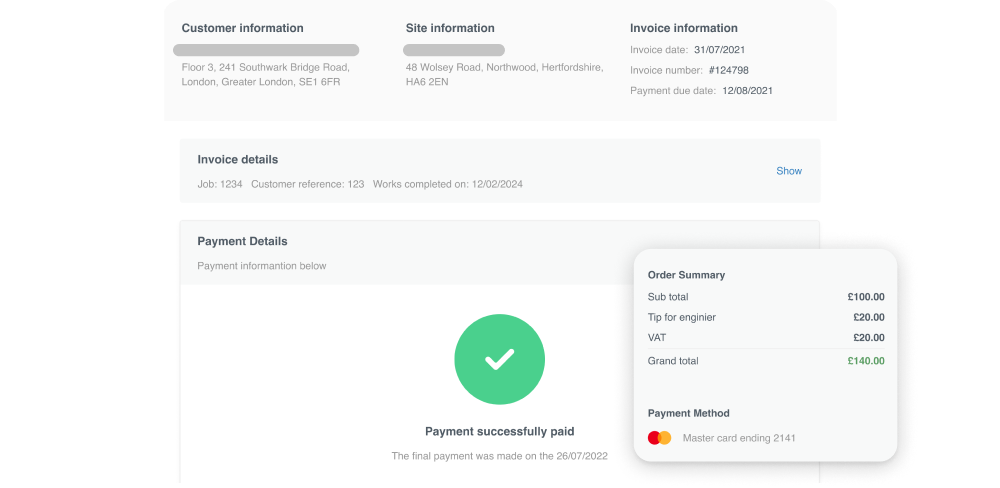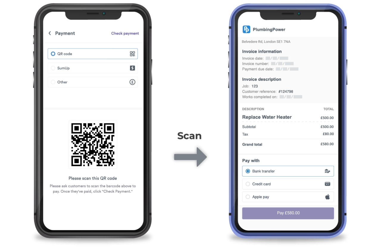 As soon as the job is complete, engineers can present customers with a QR code prompting them to “scan to pay”. This will open a personalised payment page, where customers can choose between various payment options, including Apple or Google Pay. With this method, your crew can quickly collect payment on-site, without the need to carry payment terminals.