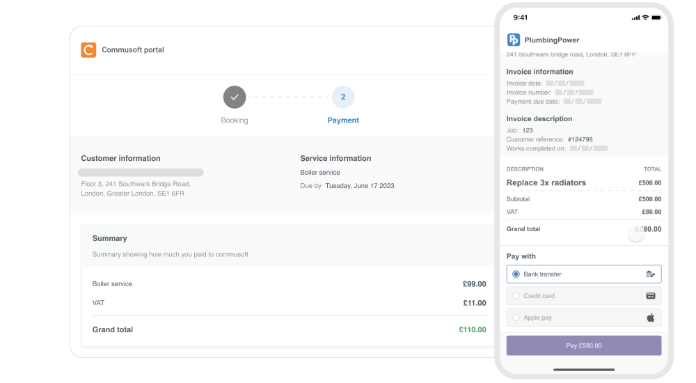 Send customers a secure payment link so they can pay when it’s most convenient for them. Here they can review their invoice, and pay via credit card, bank transfer, or Apple/Google Pay. With this process, Commusoft makes it easy for customers to pay initial deposits, partial or final invoices, as well as multi-invoice payments through a variety of specialised online portals.